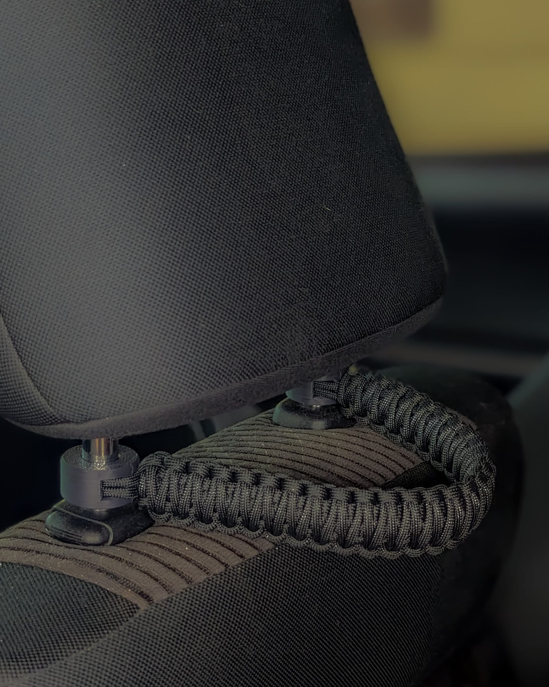 Safety and durability are built into the core of this design. The continuous paracord loop passes directly through the center of the grommet, ensuring that the high-strength cord is the component handling the tension. The custom 3D-printed ASA protective grommets serve as a shielding layer, preventing the cord from getting pinched or frayed by the sharp notches of the headrest posts. You get the strength of military-grade paracord with the protection of automotive-grade 3D printing.